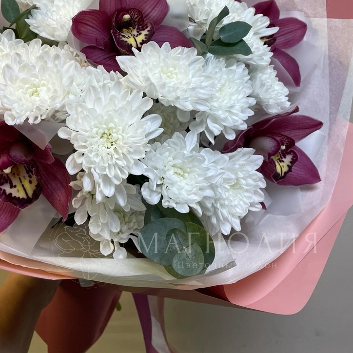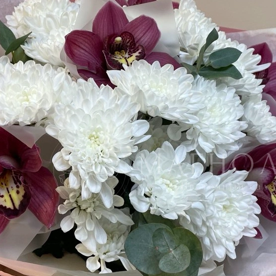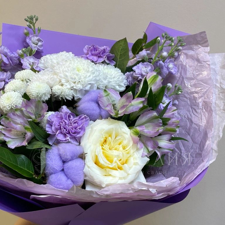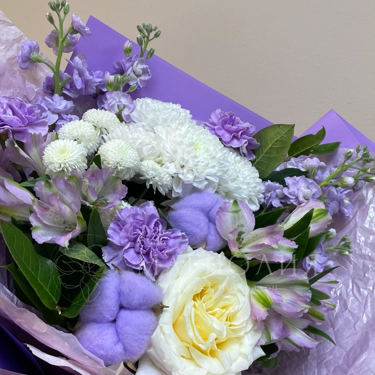 Букет, сочетающий элегантность и нежность, создан из свежих цветов в оттенках лаванды и белого. В его состав входят розы, гвоздики, хризантемы и другие цветы, гармонично дополненные зеленью. Нежная цветовая гамма и мягкие формы делают букет идеальным выбором для выражения признательности и заботы.