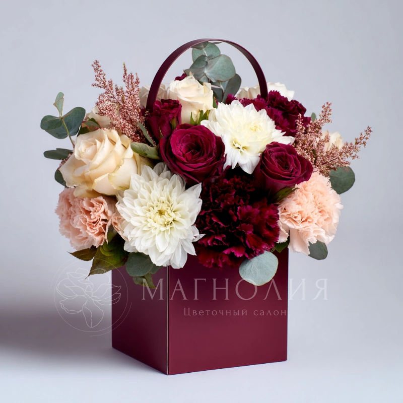 ГлавнаяКаталогКомпозицииВ сумочкахЦветы в сумочке «Ароматный стиль»