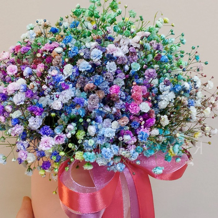 Букет представляет собой миниатюрную цветочную композициию из цветной гипсофилы. Подарите близкому человеку яркие эмоции вместе с этим воздушным букетом.