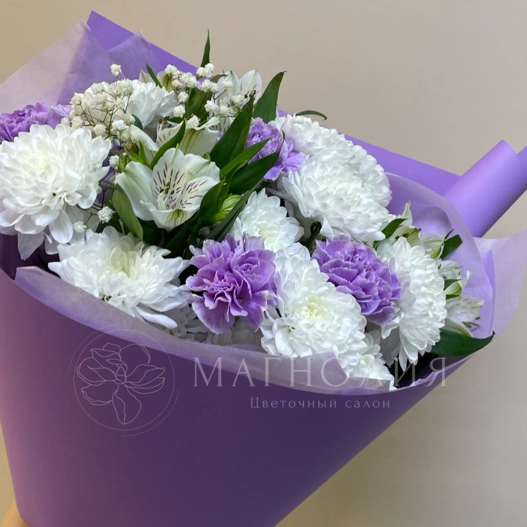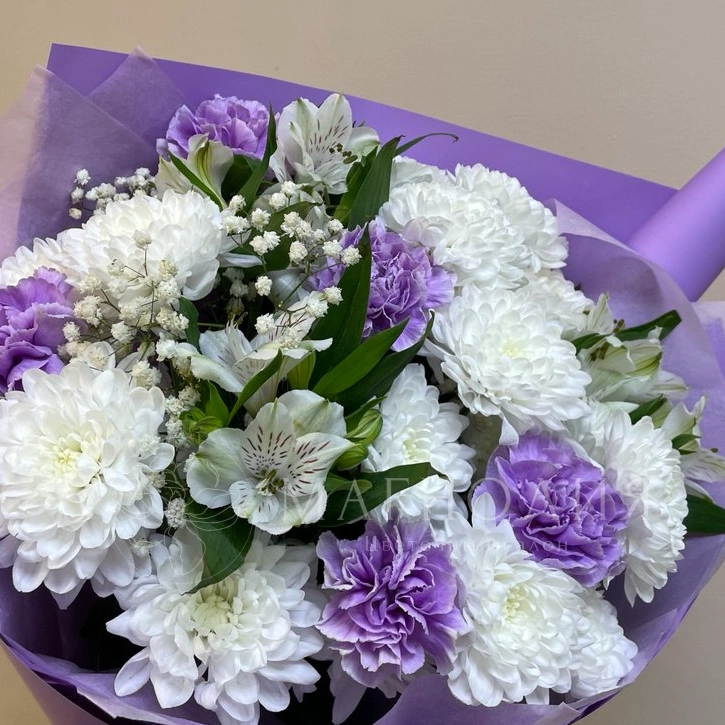 Этот букет - идеальное сочетание элегантности и нежности. Белые и лиловые цветы, такие как гвоздики, хризантемы и альстрамерии, создают эффект объёмного и яркого букета, а гипсофила добавляет легкости и воздушности. Этот букет станет прекрасным подарком для любого случая.