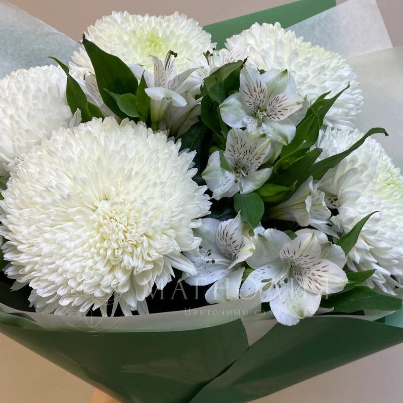 Букет, выполненный в сдержанной белой гамме, включает в себя воздушные хризантемы и элегантные альстромерии, дополненные изумрудной зеленью. Нежные цветы создают ощущение легкости и гармонии, наполняя пространство свежестью и уютом. Идеальный выбор для тех, кто ценит сдержанную красоту и безупречный стиль.