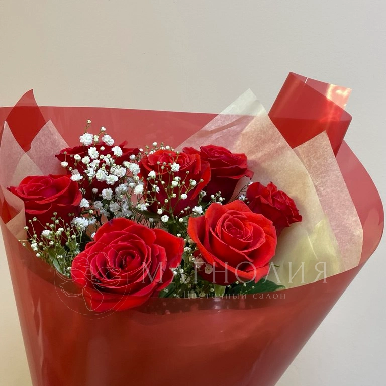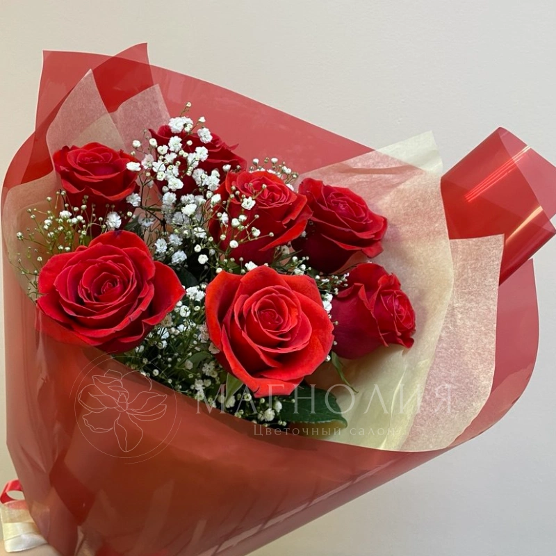 Букет из 6 пышных красных роз, дополненный изящной гипсофилой, символизирует страсть и любовь. Нежное сочетание цветов и воздушность композиции делают букет идеальным подарком для самых дорогих и близких. Яркая красная упаковка добавляет выразительности и подчеркивает элегантность букета.