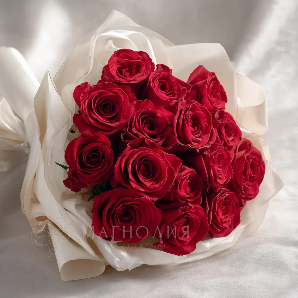 Роскошный букет из 15 алых роз с длинными стеблями — классика жанра. Подойдёт для свидания, предложения руки и сердца или выразительного комплимента.